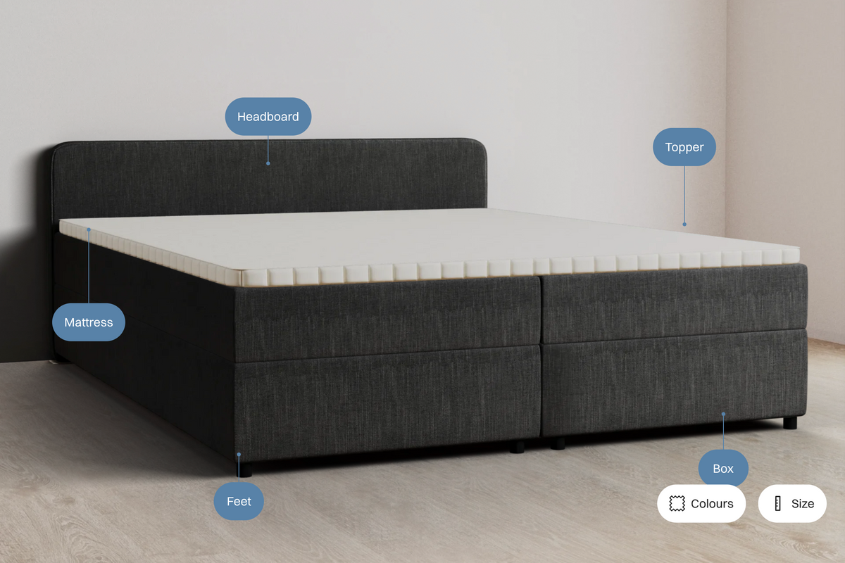 Get creative, select your preferred features and build your dream bed in a minute! With our intuitive configurator, you can design your boxspring bed exactly the way you want it. Choose your preferred headboard, firmness level, fabric and extra features, like smart storage or electrical lifting solutions. Create your own bed online with just a few clicks!