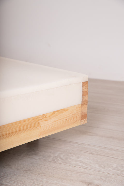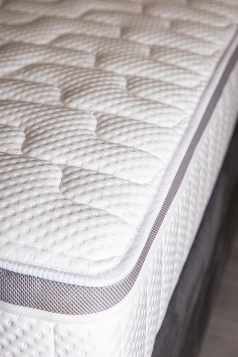 De box van het bed is gemaakt op een stevig frame van massief hout, met duurzame veren omwikkeld met zacht schuim, voor langdurige ondersteuning en uitzonderlijk comfort.